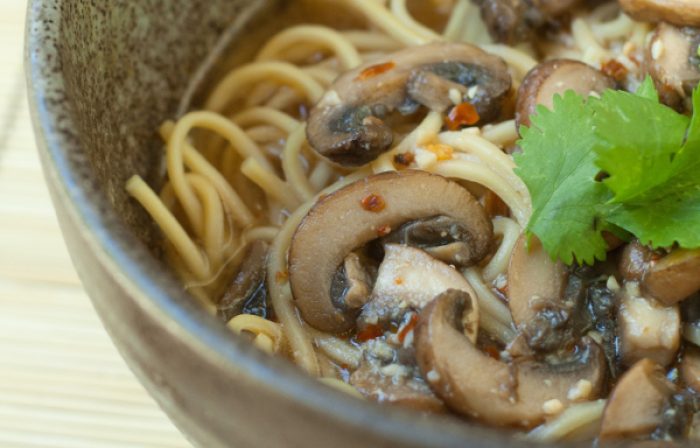 - Pour the mushroom stock through a fine-mesh strainer held directly over the pan. (Discard the solids left in the strainer.) Adjust the heat to maintain a steady simmer, and separate the cooked noodles into 3 or 4 bowls.