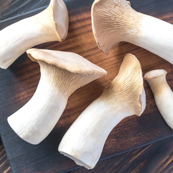 King trumpet mushrooms have a delicate, nutty flavor and a firm, meaty texture. When cooked, the king trumpet’s texture mimics seafood, like scallops. In fact, when its thick stem is sliced crosswise, the result can appear just like scallops, too. But the culinary creativity doesn’t end there; cut large king trumpet mushrooms lengthwise for slices that are ideal for grilling, sautéing, roasting, and any other cooking application that puts them at the center of the plate. They can also be fork-shredded for serving as a meaty option for barbeque sandwiches, tacos, or serving atop grilled meats.