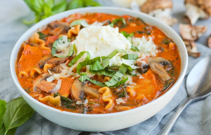 All the comforting flavors of lasagna with less work! Lasagna soup is packed with crimini mushrooms, tomatoes, spinach and lasagna noodles.