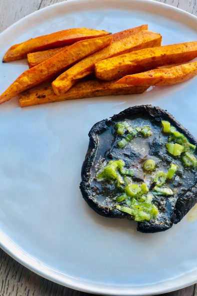 - Meanwhile, make a quick compound butter: stir the butter and green onion together. Once the mushroom caps are cooked, plate with rounded side down on the plate. Spoon some onion butter on the hot mushroom cap and let it melt. Squeeze a little lemon juice on top if desired. Serve with the cooked frites on the side.